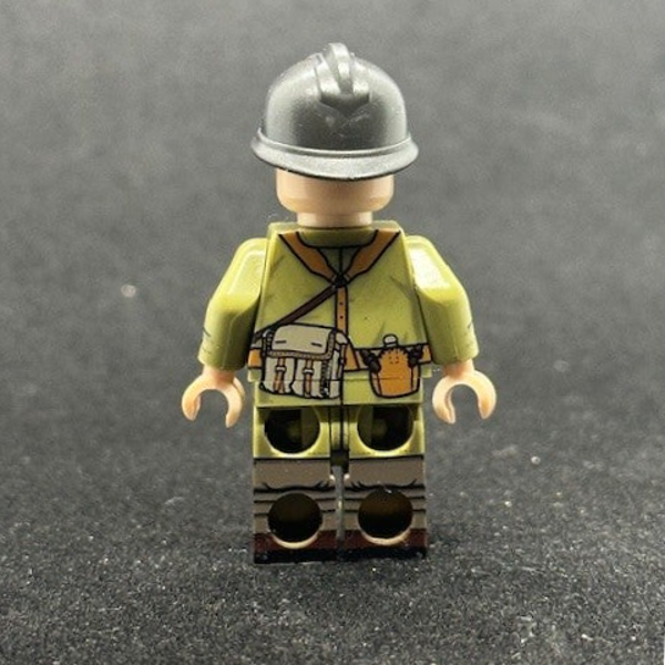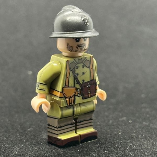 Deze gedetailleerde minifiguur stelt een Franse infanterist voor uit de vroege fase van de Tweede Wereldoorlog. Uitgerust met het herkenbare olijfgroene uniform, leren veldtassen en de klassieke Adrianhelm met “RF”-embleem (République Française), vertegenwoordigt deze soldaat het Franse leger tijdens de verdediging van het vaderland in 1940.