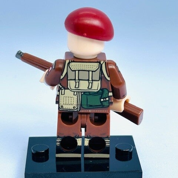 Deze replica-minifig stelt een Britse paratrooper voor, herkenbaar aan zijn rode baret. De gedetailleerde bepakking, riemen en munitietassen zijn gebaseerd op uitrusting die gebruikt werd door de 1st Airborne Division tijdens Operatie Market Garden (september 1944).