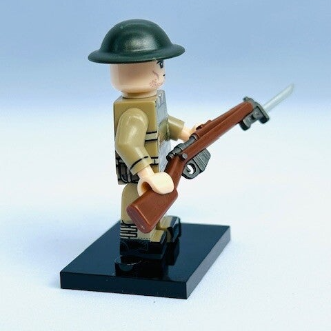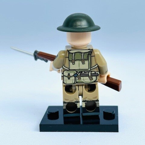 Deze replica-minifig is een klassieke Britse infanterist uit WOII. Hij draagt het typische Brodie-helmtype, een helm die vanaf de Eerste Wereldoorlog tot 1944 veel door Britse troepen werd gebruikt. Zijn tan-kleurige uniform en eenvoudige uitrusting weerspiegelen de standaard soldaat van het Britse leger in Europa.