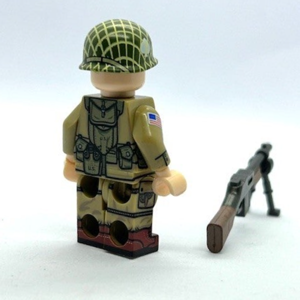 Deze replica-minifig stelt een paratrooper van de 101st Airborne Division voor, in de herkenbare stijl die je ook terugziet in de dramatisering van hun verhaal in de serie Band of Brothers. De soldaat draagt de kenmerkende M42 jump uniform met versterkte kniestukken, canvas pockets en webbing voor munitie en uitrusting. Vaak was dit uniform tijdens gevechtsoperaties donkerder gemaakt met modder of verduisteringsmiddel, iets wat deze minifig visueel goed benadert.