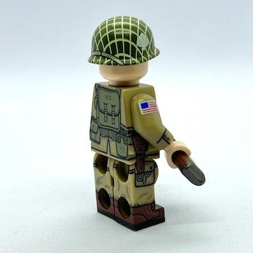 Deze replica-minifig stelt een paratrooper van de 101st Airborne Division voor, in de herkenbare stijl die je ook terugziet in de dramatisering van hun verhaal in de serie Band of Brothers. De soldaat draagt de kenmerkende M42 jump uniform met versterkte kniestukken, canvas pockets en webbing voor munitie en uitrusting. Vaak was dit uniform tijdens gevechtsoperaties donkerder gemaakt met modder of verduisteringsmiddel, iets wat deze minifig visueel goed benadert.