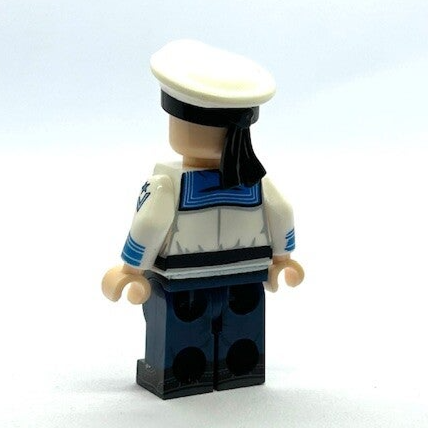 Deze replica-minifig toont een marinematroos in wit werk- en dienstuniform, geïnspireerd op de kleding die Duitse zeelieden in de Tweede Wereldoorlog droegen aan boord van oppervlakteschepen en tijdens ceremoniële taken in de haven. De witte blouse, kraagstrepen en zeemanspet zijn typische kenmerken van marinepersoneel dat diende op torpedobootjagers, kruisers of in havenfaciliteiten.