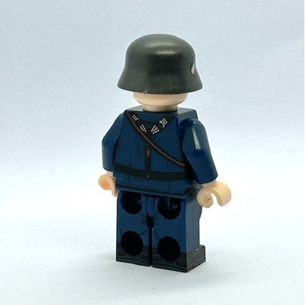 Deze replica-minifig toont een marinesoldaat met donker uniform en stalen helm, een combinatie die vaak voorkwam bij bemanningsleden van kustverdedigingsposten, onderzeebootbases en dekbewaking. De helm duidt op personeel dat ook ingezet kon worden tijdens alarmsituaties of beschermingstaken in gevechtszones.